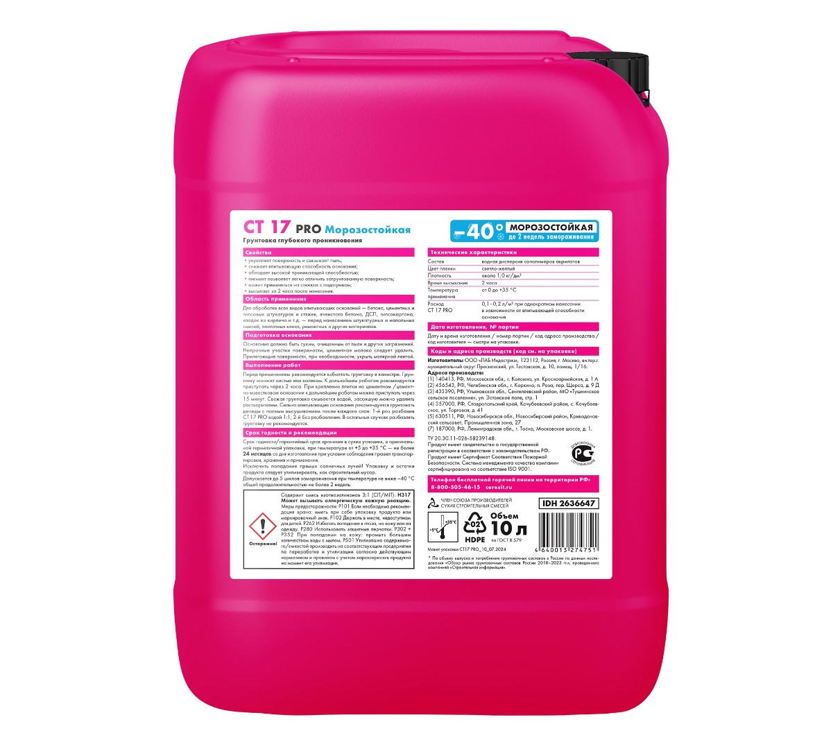 Описание товара: "Грунтовка Ceresit СТ 17 PRO 10 л морозостойкий"